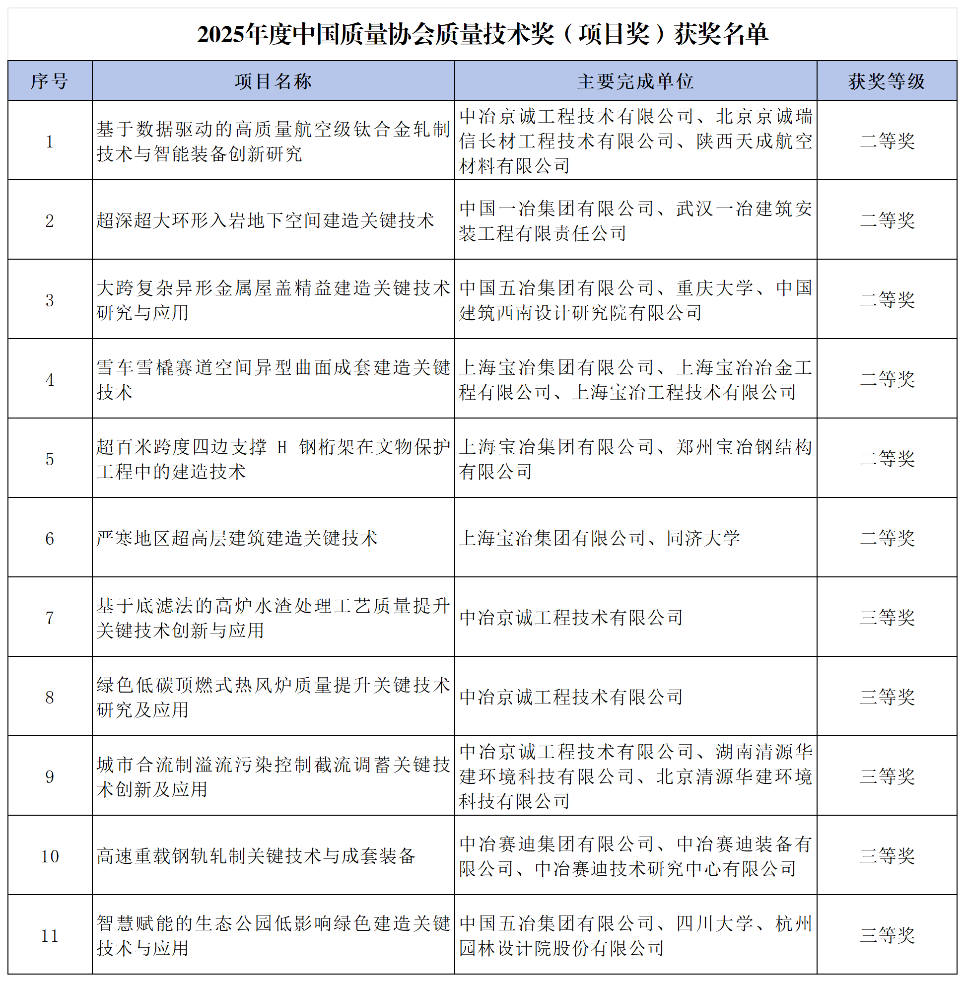 近日,中國質(zhì)量協(xié)會正式公布《2025年度中國質(zhì)量協(xié)會質(zhì)量技術(shù)獎獲獎名單》,中國中冶共計有5家子企業(yè)的11項質(zhì)量技術(shù)創(chuàng)新與實踐成果獲獎,其中二等獎6項、三等獎5項,獲獎總數(shù)同比增加1項,二等獎數(shù)量同比增加5項,獲獎數(shù)量和質(zhì)量實現(xiàn)雙提升,以實際行動助推公司質(zhì)量技術(shù)發(fā)展。